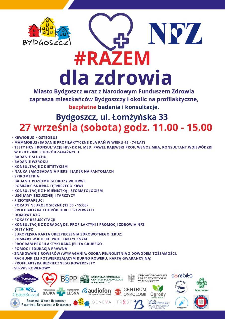 W sobotę 27 września zapraszamy wszystkich na wydarzenie profilaktyczne pt. #RAZEM dla Zdrowia, które odbędzie się w siedzibie Kujawsko-Pomorskiego Oddziału Wojewódzkiego NFZ w Bydgoszczy, przy ul. Łomżyńskiej 33, w godzinach: od 11.00 do 15.00.